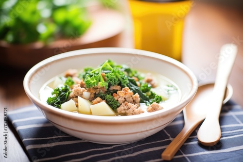 bowl of zuppa toscana with parsley garnish, spoon beside
