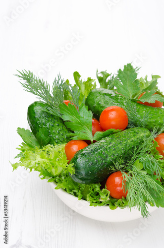 bowl with fresh vegetables for salad vertical close-up