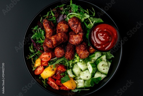 bowl, meat, salad, cucumber, tomatoes, meal, diet, food, dish, lunch, dinner, healthy, delicious, fresh, cookery, vegetable, epicure, nourishment, balanced, protein, culinary, eating, eatery, ingredient, organic, plate, gastronomy, cooked, tasty, vibrant, pepper, leaf, green, red, raw, sauce, vegetarian, vegan, prepared, serving, indoor, table, dark, background, studio