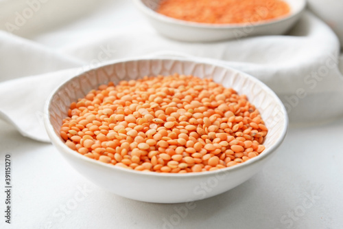 Bowl with raw lentils on light table