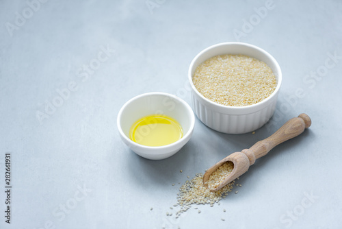 Bowl with sesame oil in glass and seeds on gray wooden background. Copy space. Soft focus.