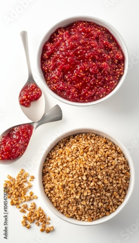 Bowls of Cooked Wheat Berries and Vibrant Raspberry Jam with Spoons on a Clean White Background.