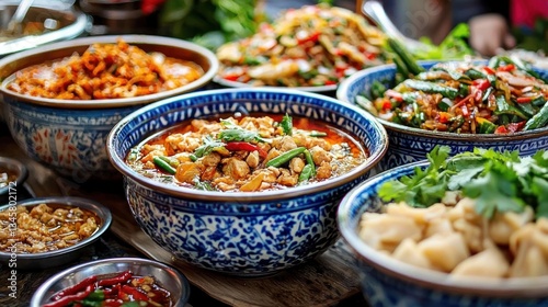 food, cookery, dish, bowl, meal, lunch, dinner, vegetable, sauce, spicey, green, red, ingredient, pepper, chili, garlic, onion, herb, cilantro, broth, meat, poultry, chicken, pork meat, beef, epicure, asian, cooked, fresh, delicious, tasty, favor, vibrant, arrangement, rustic, wooden, table, plate, presentation, closeup, variety, colourful, eating, healthy, texture, background, preparation