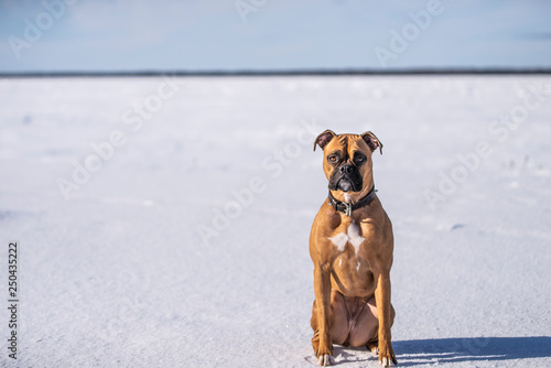 animal, dog, boxer, gold, pet, canino, doggy, puppy, puppy, young, beautiful, clean, happy, healthy, friendly, walk, leash, winter, cold, sunny, sun, warm, water, cute, ocean, glacé, quebec, canada, strong, loyal, to sit, racked, tree, snow, season, short, small, small dog, medium, detail, detail, sharp