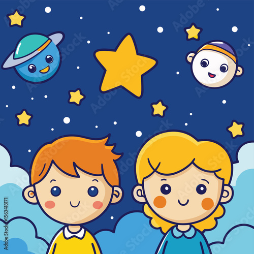 moon, star, night, cartoon, vector, christmas, illustration, space, sky, baby, children, star, snow, winter, children, astronaut, tree, holiday, cloud, sleep, dream, boy, design, planet, rocket
