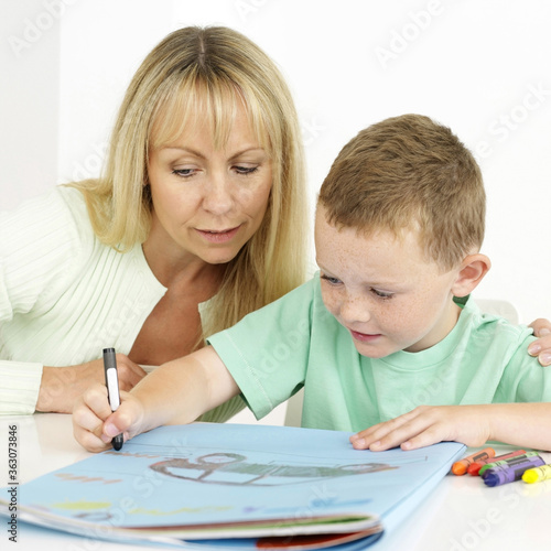 art, bonding, boy, cardboard, caucasian, children, childhood, children, colouring, colouring, concentration, wax crayons, creativity, female, front view, guidance, happiness, hobby, holding, indoor, indoor, intelligence, children, lady, male, mother, sitting, son, togetherness, two people, watching, woman