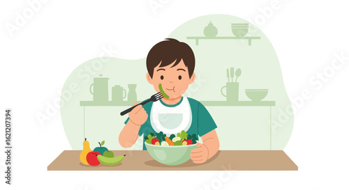 Boy Enjoys Healthy Eating Habits With A Delicious And Colorful Salad In The Kitchen