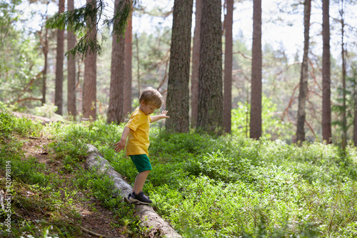 standing, looking, looking down, children, toddler, male, boy, carefree, childhood, curiosity, enjoyment, fun, escape, freedom, innocence, calm, tranquil scene, one person, northern europe, finland, full-length, selective focus, tree, casual clothes, timberland, forest, outdoors, day, exploration, leisure, nature, travel, travel destination, boy, wearing, learning, calmness