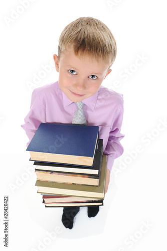 boy holds a stack of books