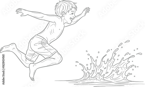 boy, jumping, water, splash, outline, summer, fun, children, children, youth, active, activity, recreation, vacation, holiday, travel, swimming, pool, sea, ocean, wave, ripple, dripped, wet, happy, joy, cheerful, carefree, playful, energy, motion, line, drawing