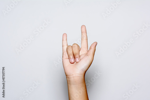 Boy raising hand show that love on white backgrounds