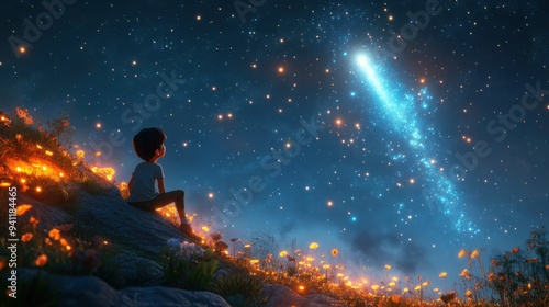 boy, sitting, beautiful, hill, looking, up, comet, starry, night, sky, funny, romantic, facial, expression, three-dimensional, style, cartoon, character, star, space, science, universe, cosmos, astronomy, planet, cosmic, galaxy, people, nature, silhouette, look, illustration, observe, moon, children, man, watching, dark, children, pointing