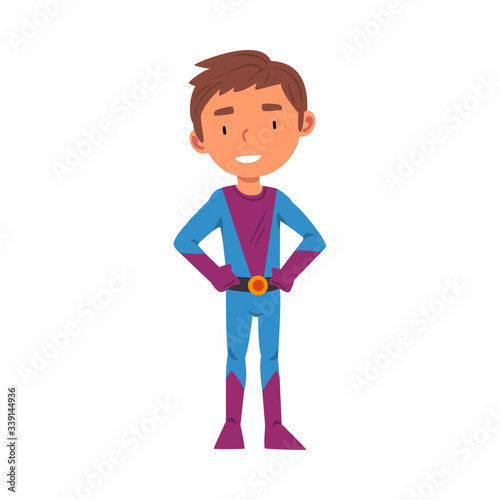 Boy Wearing Superhero Carnival Costume, Cute Kid Playing Dress Up Game Cartoon Vector Illustration