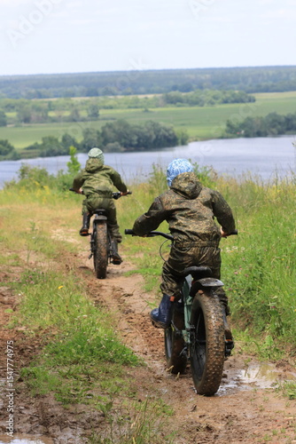 Boys in waterproof clothes and rubber boots ride fatbikes. A fat bike for off-road use