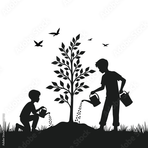 children, planting, tree, watering, garden, nature, growth, bird, silhouette, outdoors, spring, summer, activity, care, conservation, environment, teamwork, learning, childhood, illustration, black-and-white, simple, graphic, day, grass, dirtied, watering can, bucket, sky, flying, young, sapling, germ bud, nurturing, helping, future, sustainability, organic, agriculture, rural, countryside, landscape, black