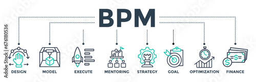 BPM web icon vector illustration concept of business process management with icons of design, model, execute, mentoring, strategy, goal, optimization, finance
