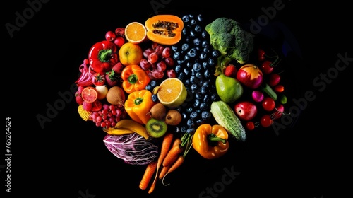 Brain composed of vibrant fruits and vegetables, conceptual illustration promoting healthy eating for cognitive function, digital art