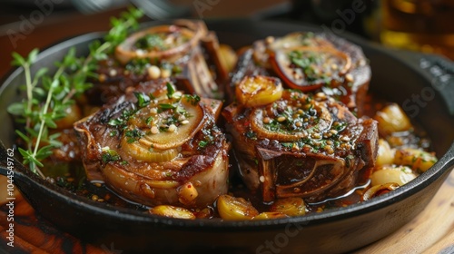 Braised Lamb Shanks with Caramelized Onions and Herbs in Cast Iron Skillet