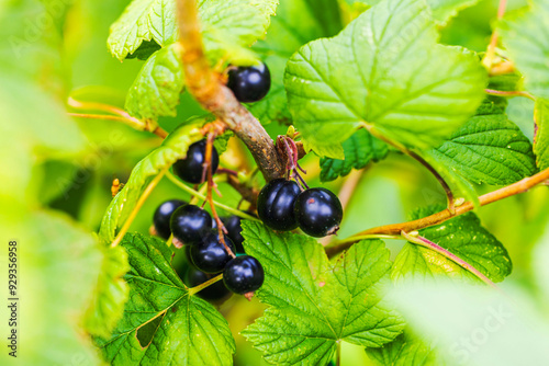 Branch of blackcurrant bush with ripe black currant and lush green leaves in garden setting.