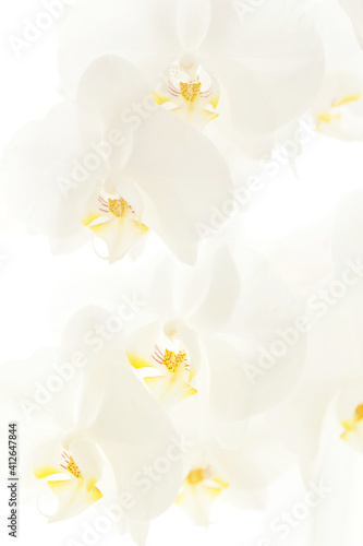 Branch of white Moon orchids. Close up of white orchids on light background. Moon Orchid flower on blur background in composition with copy space. vertical image