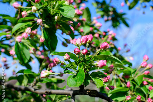 Branch with many delicate small pink apple tree flower buds and green leavesin a gardenor orchard in a sunny spring day, beautiful Japanese blossoms floral background, sakura.