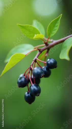 Branch with ripe, dark berries and vibrant green leaves against a blurred natural background, highlighting the contrast and detail of the foliage and fruit