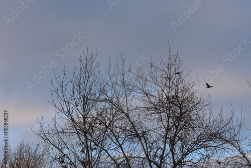 tree, sky, nature, winter, tree, blue, forest, cloud, tree branch, snow, landscape, cold, white, frost, season, wood, ice, spring, bare, branch, silhouette, autumn, cloud, glacé, flock of birds