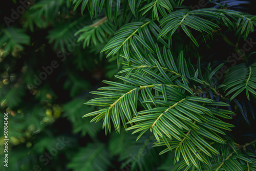 Branches of a yew plant on a dark background. Photo of nature.