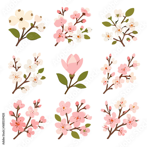 vector, icon, blossom, cluster, magnolia, dogwood, branch, stem, cherry, flower, twig, almond, flowering, apricot, bloom, sprig, peach, plum, apple, plant, nature, botany, leaf, collection, set, vegetation, foliage