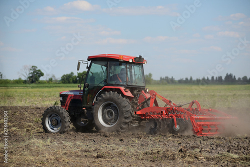 Brand new red tractor on the field working. Tractor cultivating soil and preparing a field for planting