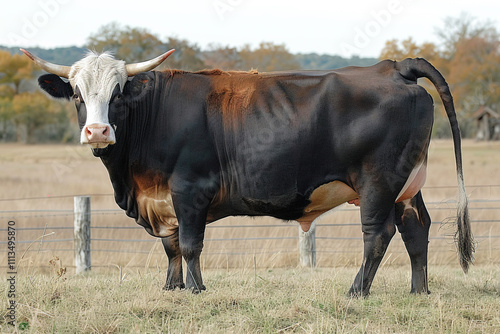 Brangus cow grazing peacefully in a pasture during a sunny afternoon
