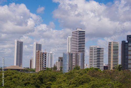 Brazilian old town of Olinda, aerial view with the city of Recife in the background, with the Atlantic ocean and bright blue sky.