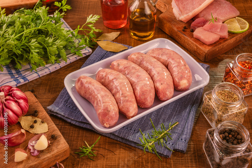 Brazilian pork leg sausage on white plate with spices and ingredients - Linguiça de pernil