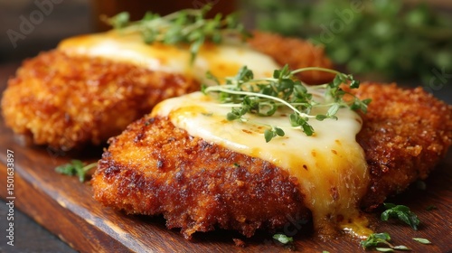 Breaded chicken cutlet with melted cheese on wooden plate, close-up food photo