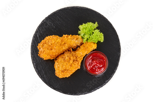Breaded crispy chicken legs with ketchup, isolated on white background.