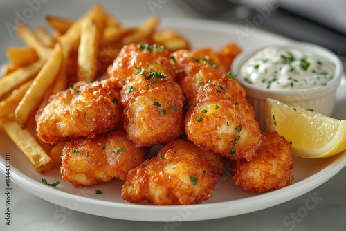 Breaded fish and chips with tartar sauce, lemon, and parsley