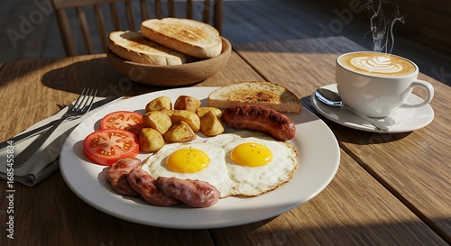 breakfast, fried egg, sausage, tomatoes, potato, toast, plate, wooden, table, latte, hot drink, eating, food, dish, cup, cooked, light, meal, healthy, warm, shadow, morning, still life, closeup, rustic, natural, brown, white, fork, knife, hot, dining, lifestyle