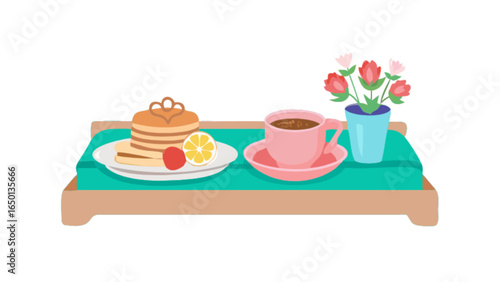 Breakfast tray with pancakes coffee and flowers offers a delightful start to the day experience now