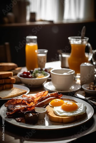 food, meal, table, breakfast, eatery, plate, dinner, bread, orange, dish, lunch, fruit, glasses, buffet, meat, delicious, fish, healthy, salad, epicure, snack, fresh, tasty, drink, juice