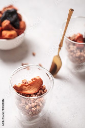 Breakfast with granola. Granola with Chia and apricot. Light background. Healthy breakfast. Wholesome breakfast