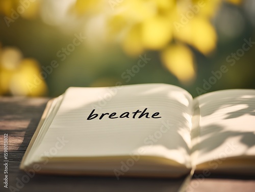breathe, open book, inspiration, motivation, mindfulness, nature, word, text, message, relaxation, calm, serene, peaceful, tranquil, wellness, well-being, healthy, positive, hope, optimism, healing, outdoors, sunshine, leaf