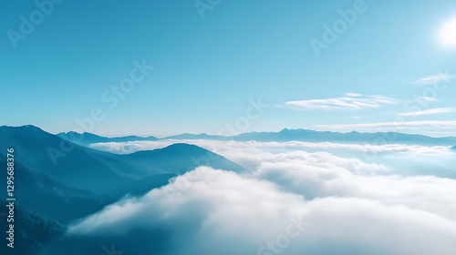 Breathtaking aerial view of mountains covered in mist and clouds under a clear blue sky during daytime : Generative AI