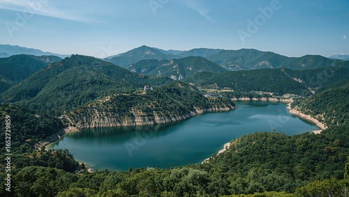 Breathtaking Bird's-Eye Perspective of a Lake Enclosed by Vibrant Green Hills and Peaks