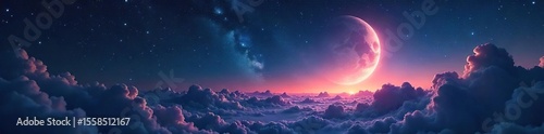 Breathtaking Celestial Landscape Crescent Moon Illuminates Cosmic Nebula and Distant Galaxies