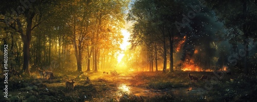 Breathtaking Forest Landscape Divided by Light and Shadow, Showcasing a Serene Wilderness Scene with a Dramatic Contrast of Nature's Beauty and Turmoil