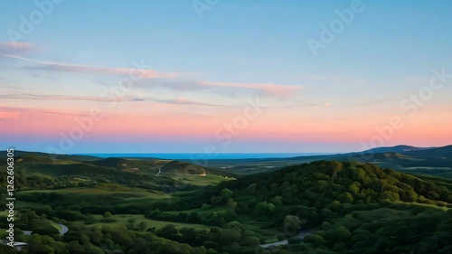 Breathtaking hills under a pastel sunset.