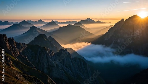 mountain, sunrise, dawn, morning, landscape, scenic, majestic, nature, wilderness, mist, fog, cloud, vale, peak, summit, golden hour, light, sky, tranquil, peaceful, serene, travel, adventure, horizon, beautiful, huge, elevation, alps, hiking, mountain, snow, sunset, panorama, view, winter, sun, cloud, high, hill, summer, forest, rock, scenery