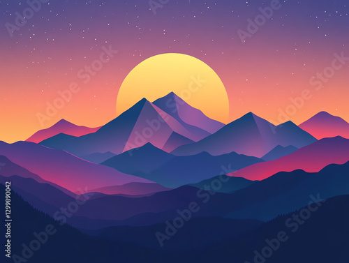 Breathtaking mountain range at sunset with vibrant colors and starry sky.
