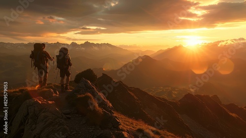 Breathtaking mountain sunrise panorama with silhouette hikers. Silhouettes of hikers reaching a mountain peak at sunrise.