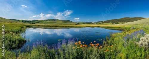 Breathtaking panoramic landscape reflecting on pristine lake in blooming meadow